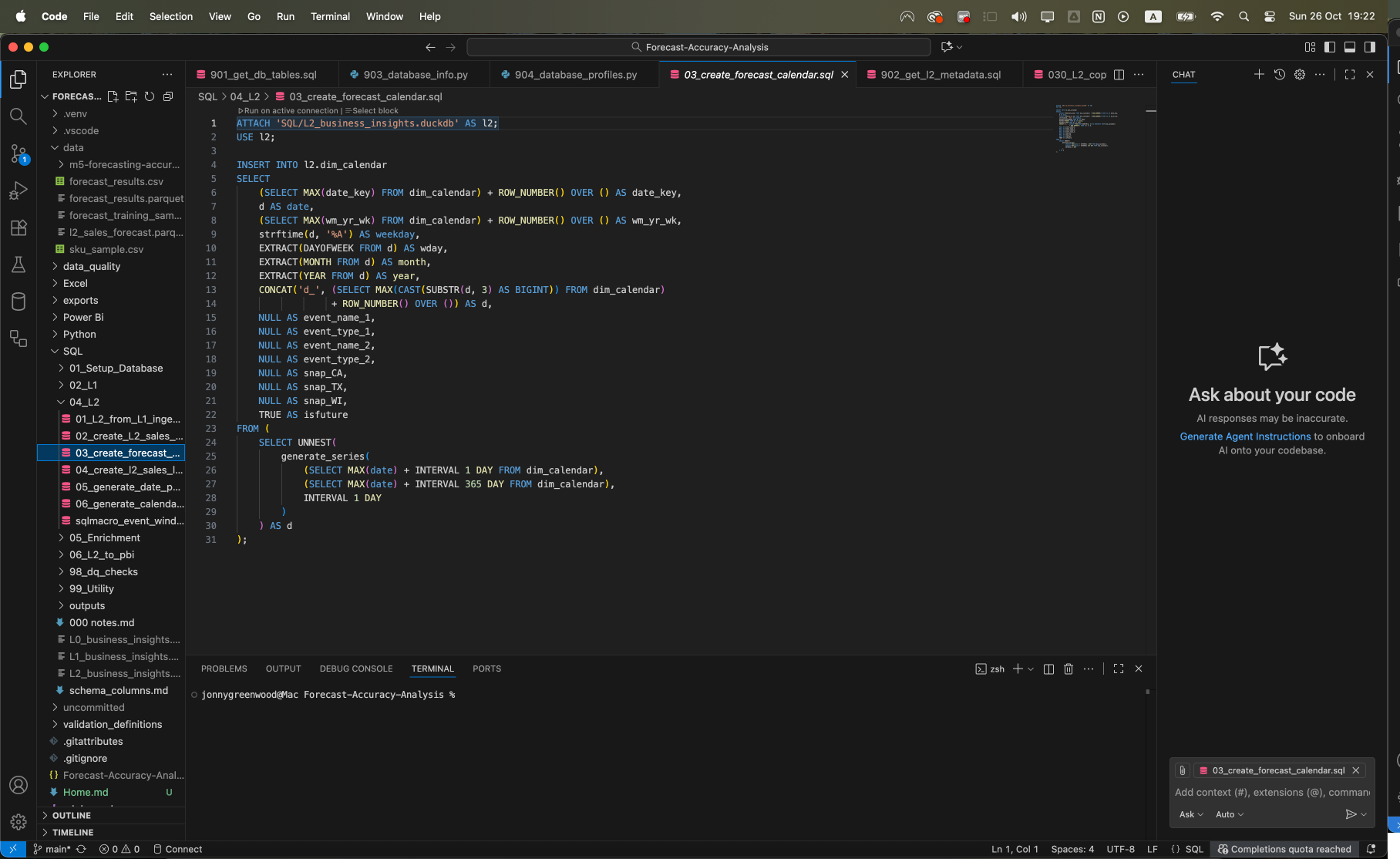 | Data reshaping | Pivoting, unpivoting, and flattening hierarchical data | 04_L2/02_create_L2_sales_long.sql |